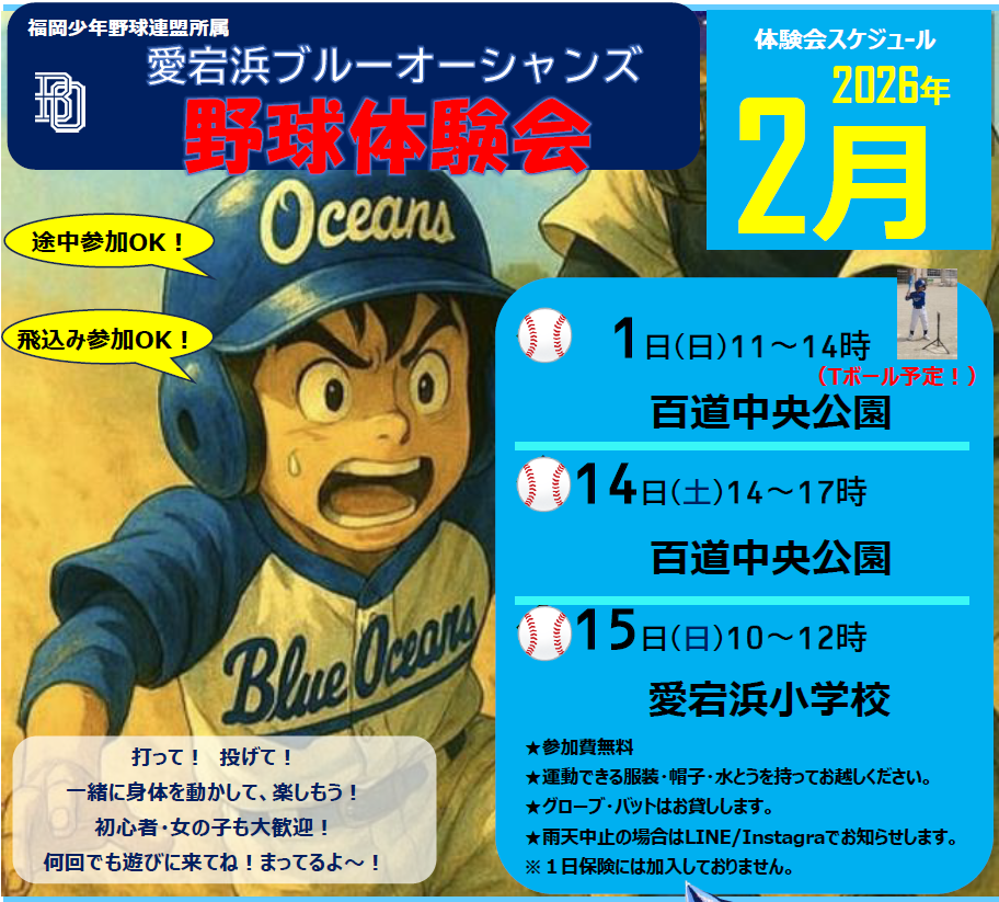 野球体験会(2/1,14,15)のお知らせ2026年1月27日