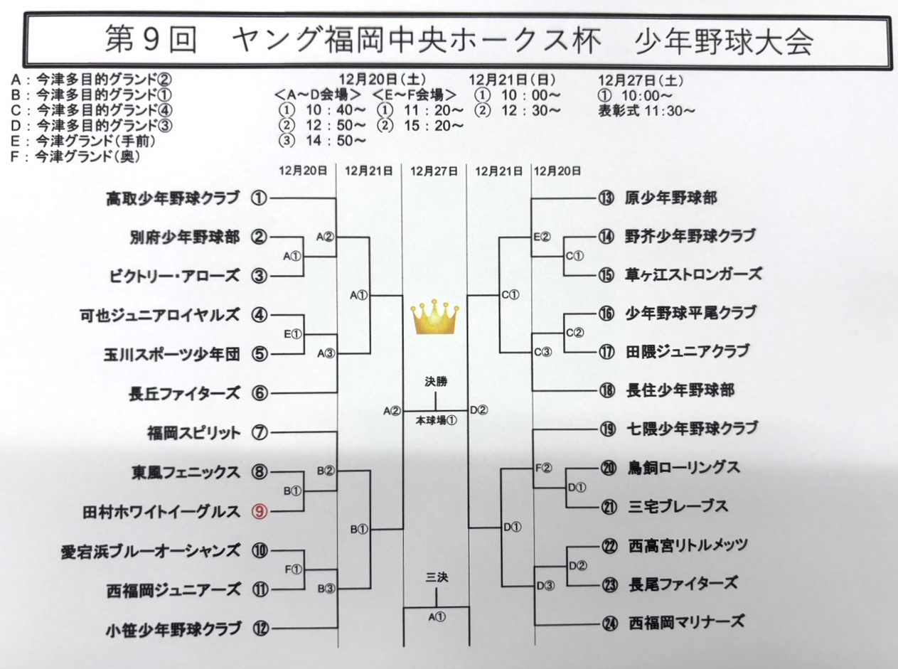 第9回ヤング福岡中央ホークス杯少年野球大会 2025.12.20~ トーナメント表